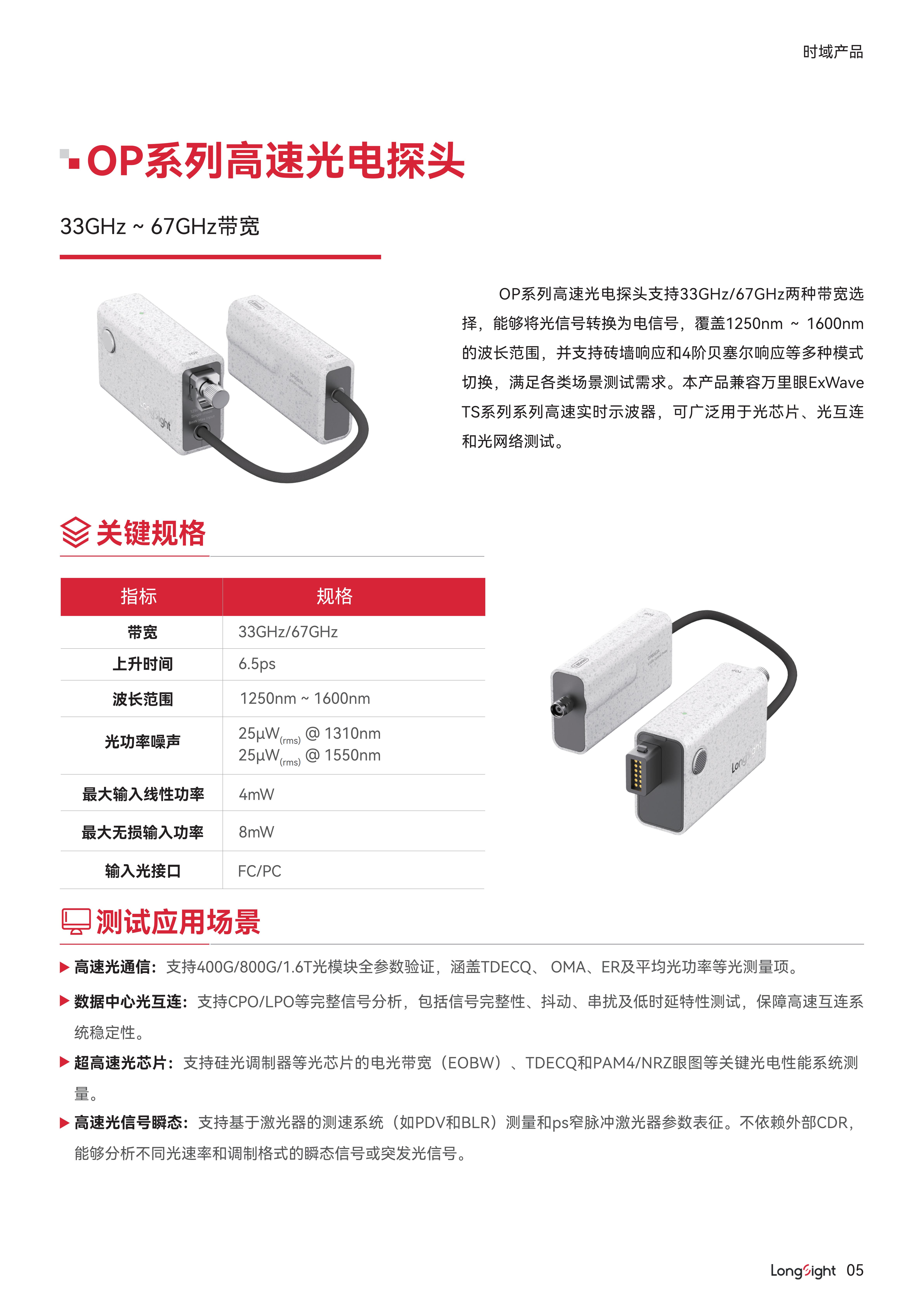 OP系列高速光电探头支持33GHz/67GHz两种带宽选择,能够将光信号转换为电信号,覆盖1250nm~1600nm的波长范围,并支持砖墙响应和4阶贝塞尔响应等多种模式切换,满足各类场景测试需求。